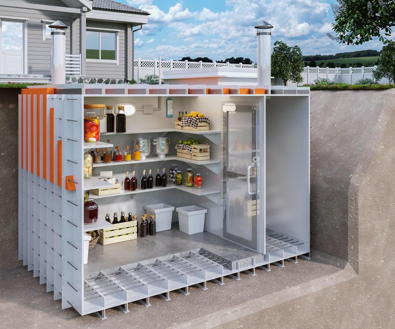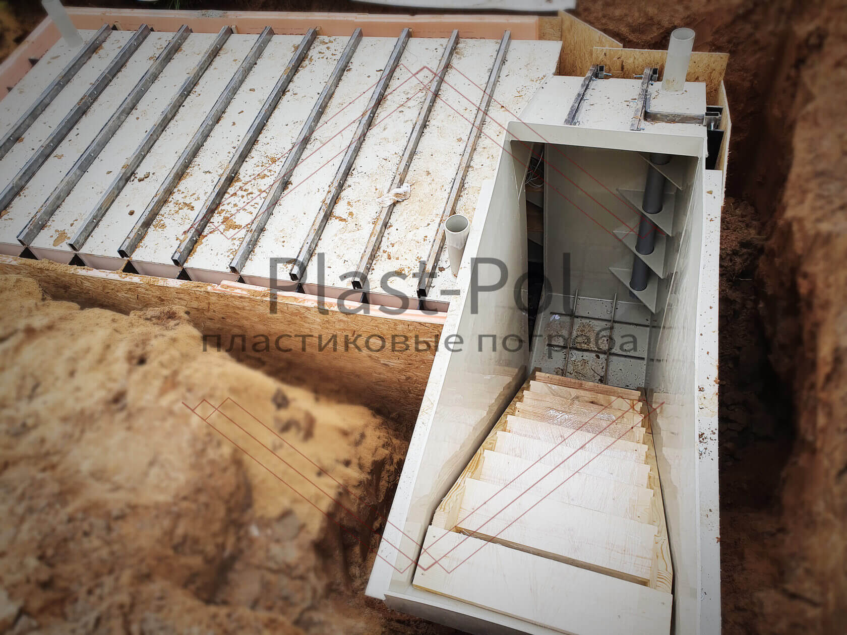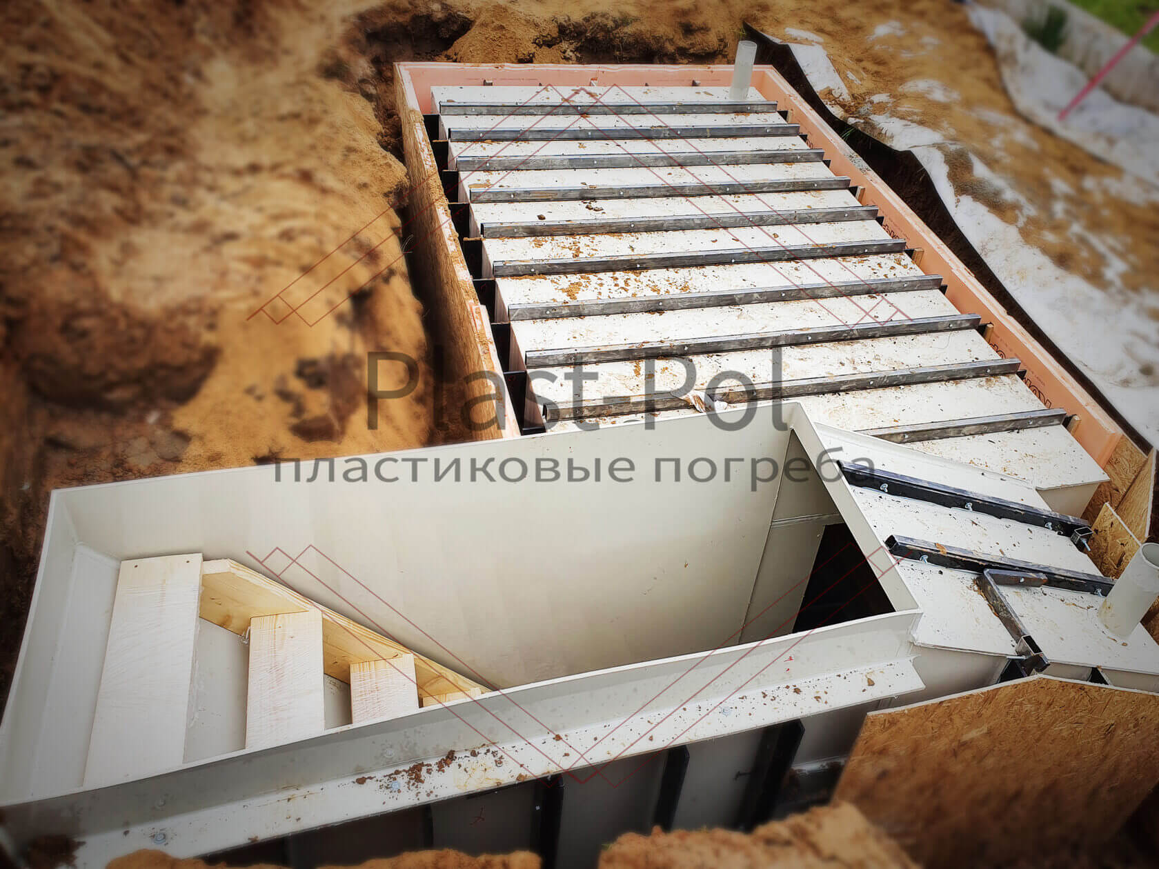 Для изготовления погреба используются монолитные листы полипропилена 10 мм из первичного сырья. Армированные ребра жесткости 150 мм усилены металлопрофилем. При монтаже используется готовый раствор бетона М300, создающий внешний каркас по периметру для защиты от промерзания грунта и других разрушающих факторов. Эта модель имеет утепленную пластиковую крышку и дополнительную дверь ПВХ, которая ведет в основную камеру.