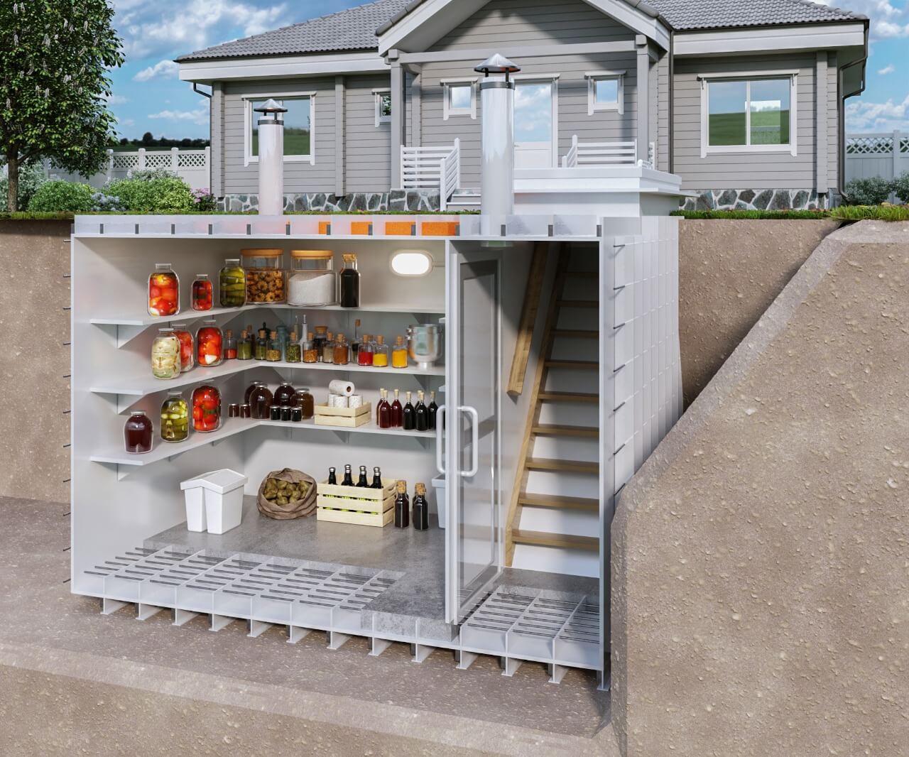 «Модерн» с повернутой на 90° входной группой. Инженерное решение и особенности монтажа позволяют устанавливать модуль в гараже/бытовке/веранде и на открытых участках с последующей надстройкой. Благодаря вентиляционной системе в камере поддерживается оптимальная влажность и уровень кислорода, она гарантирует отсутствие плесени и неприятных запахов. Деревянная лестница с поручнем, установленная под углом 45°, позволяет безопасно спуститься в подземный погреб.