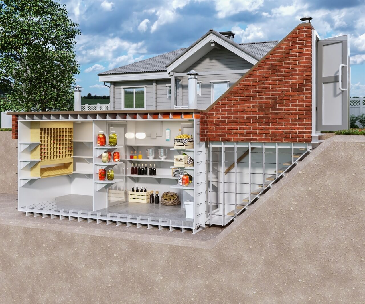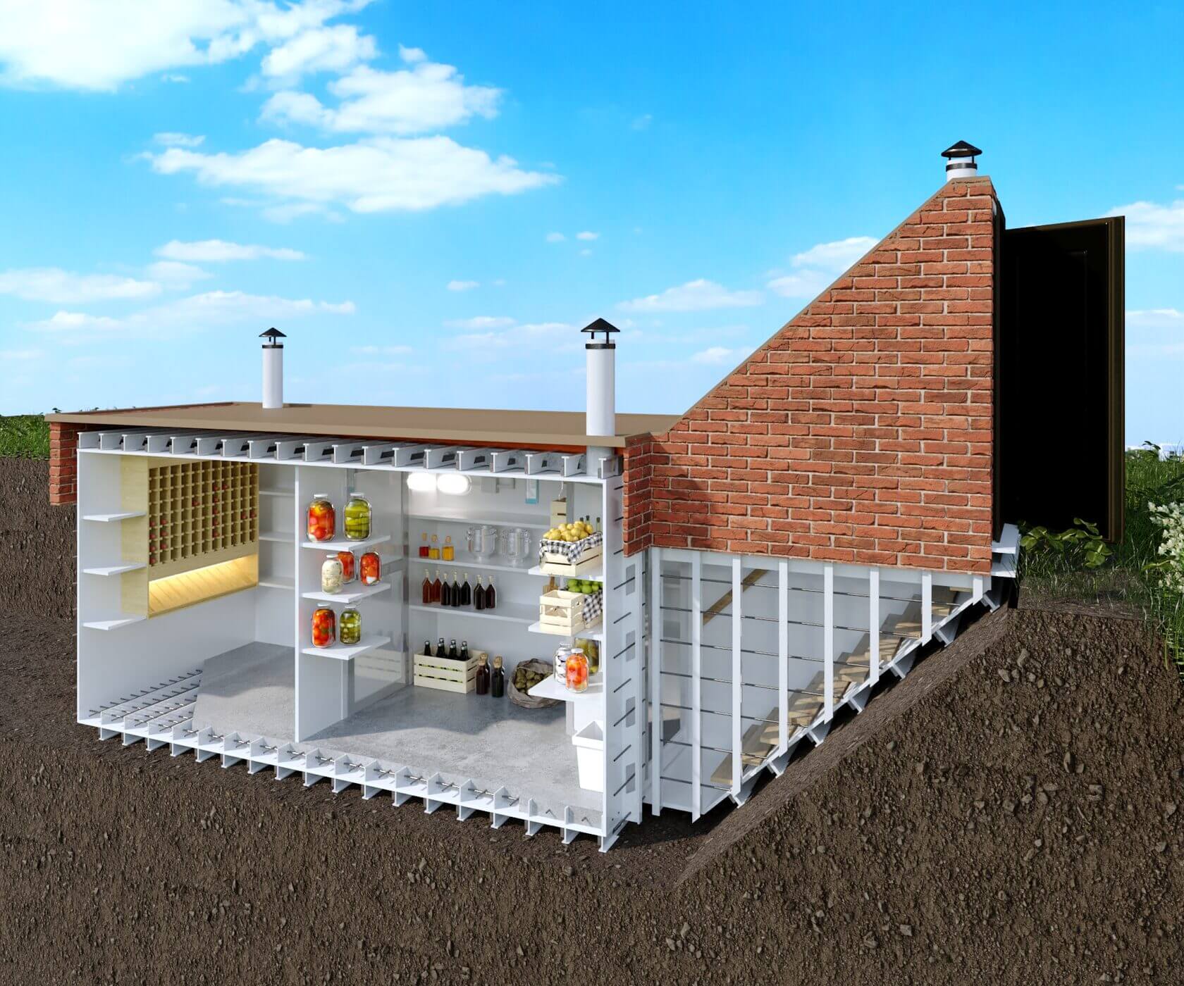 Однородная 10-мм толщина монолитного пищевого пластика обеспечивает герметичную защиту внутреннего помещения от проникновения грызунов. Система вентиляции и характеристики полипропилена защищают модуль от плесени и грибков. Количество пластиковых полок, их эргономичное расположение по всему периметру хранилища дают возможность максимально заполнить погреб фруктами, овощами и консервированной продукцией.