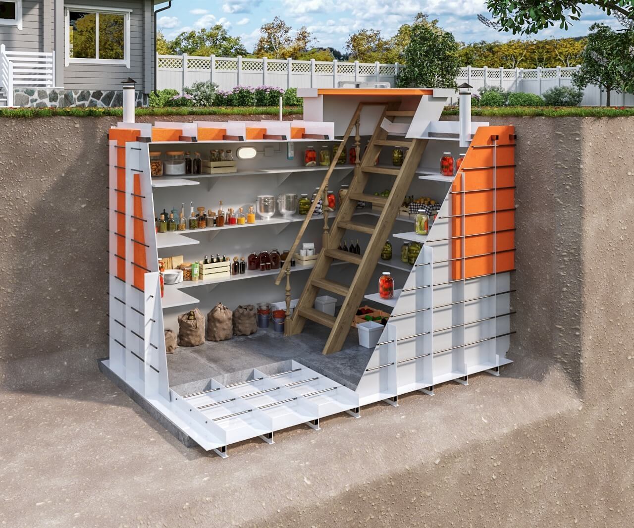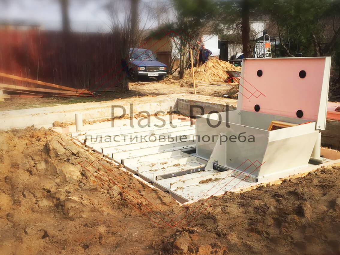 Герметичный погреб, при монтаже используется раствор бетона марки М300 для создания внешнего каркаса по всему периметру, не подвержен коррозии и гниению. Ширина армированных ребер жесткости 150 мм, конструкция усилена металлопрофилем, защищает модуль от механических воздействий при промерзании грунта.